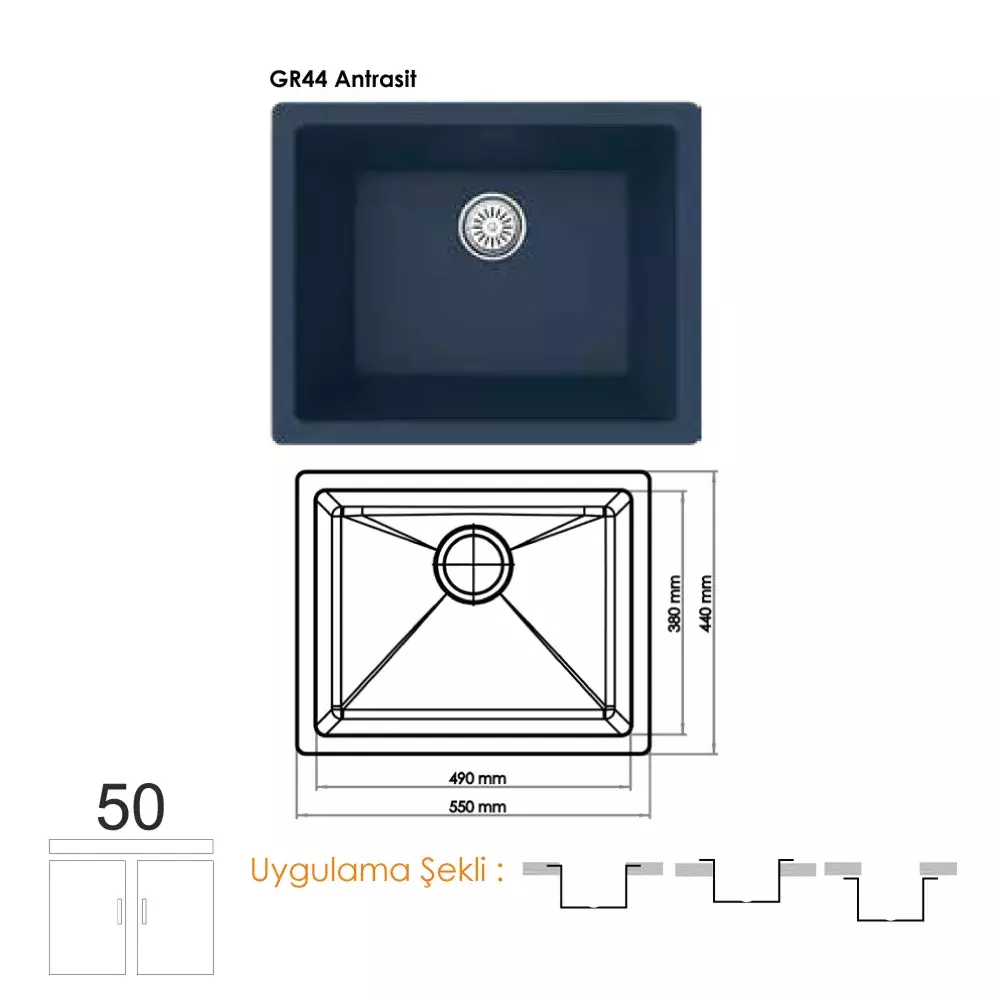 Ürün Adı: Gradde Quartz Tek Göz Granit Eviye 44*44 cm