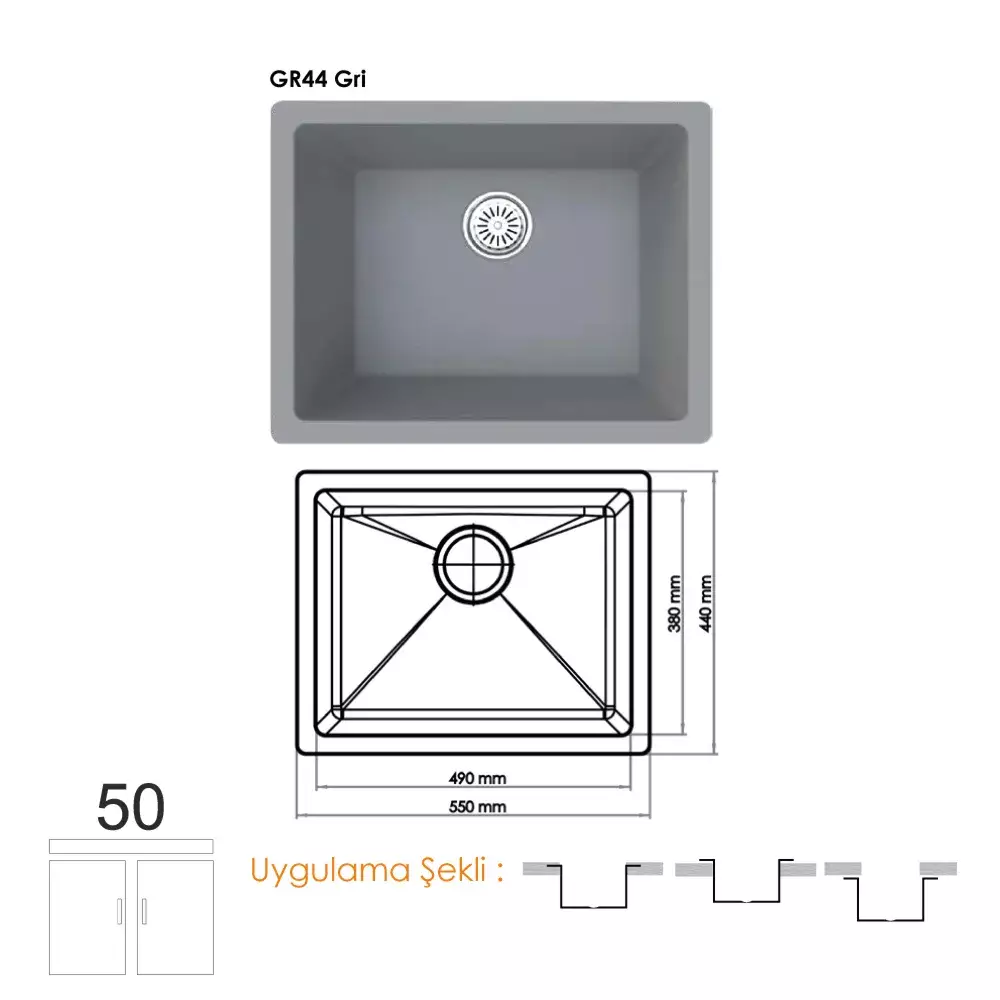 Ürün Adı: Gradde Quartz Tek Göz Granit Eviye 44*44 cm