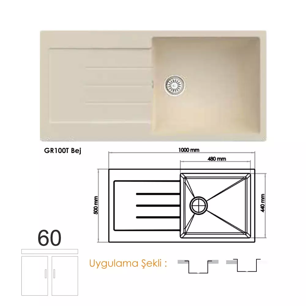 Ürün Ad: Gradde Quartz Tek Göz Granit Eviye, 50X100 Cm Bej