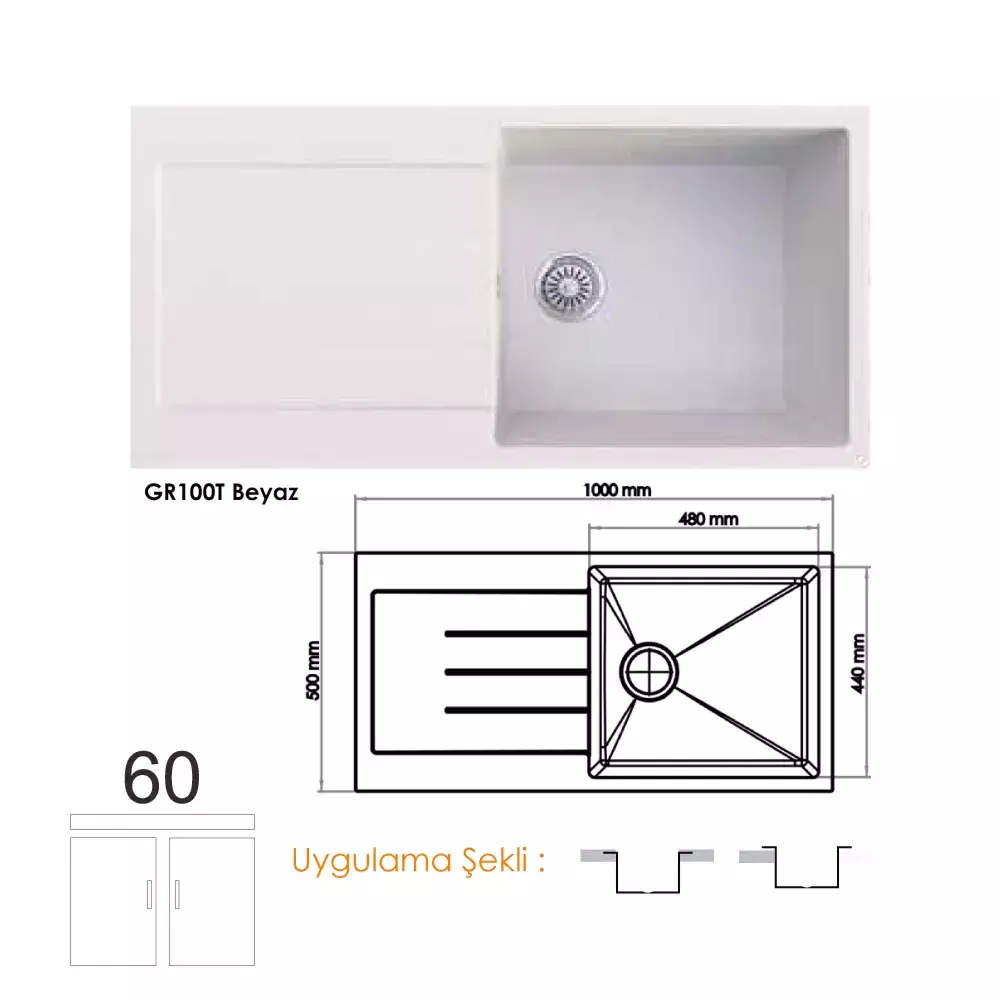Ürün Ad: Gradde Quartz Tek Göz Granit Eviye, 50X100 Cm Beyaz