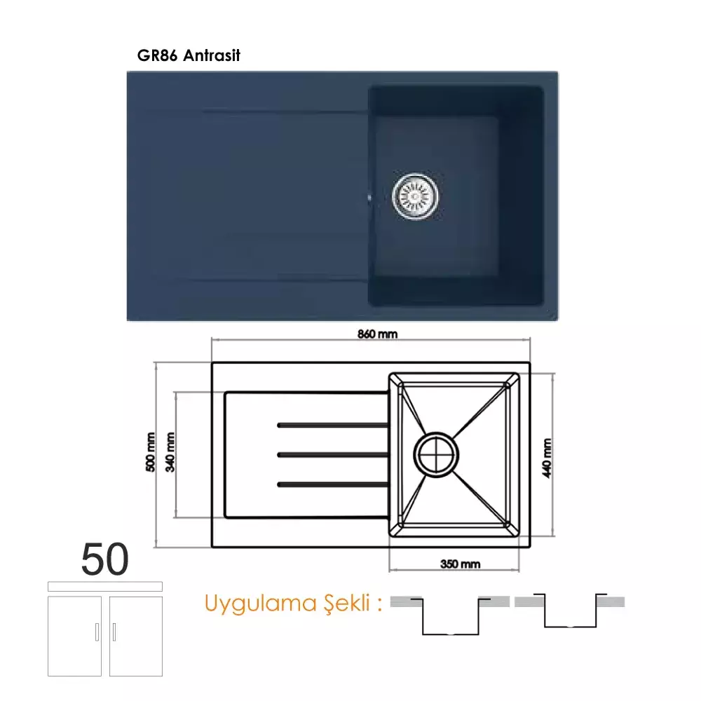 Ürün Ad: Gradde Quartz Tek Göz Granit Eviye 50x86 cm, Antrasit