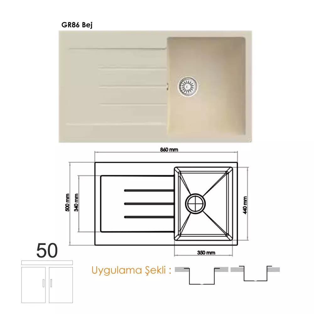 Ürün Ad: Gradde Quartz Tek Göz Granit Eviye 50x86 cm, Bej