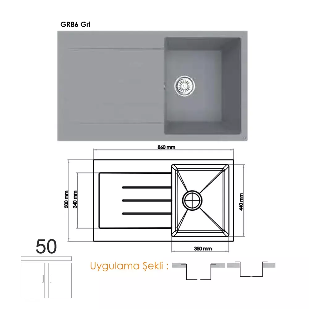 Ürün Ad: Gradde Quartz Tek Göz Granit Eviye 50x86 cm, Gri