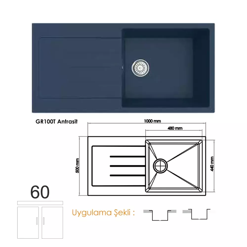 Ürün Ad: Gradde Quartz Tek Göz Granit Eviye, 50X100 Cm Antrasit