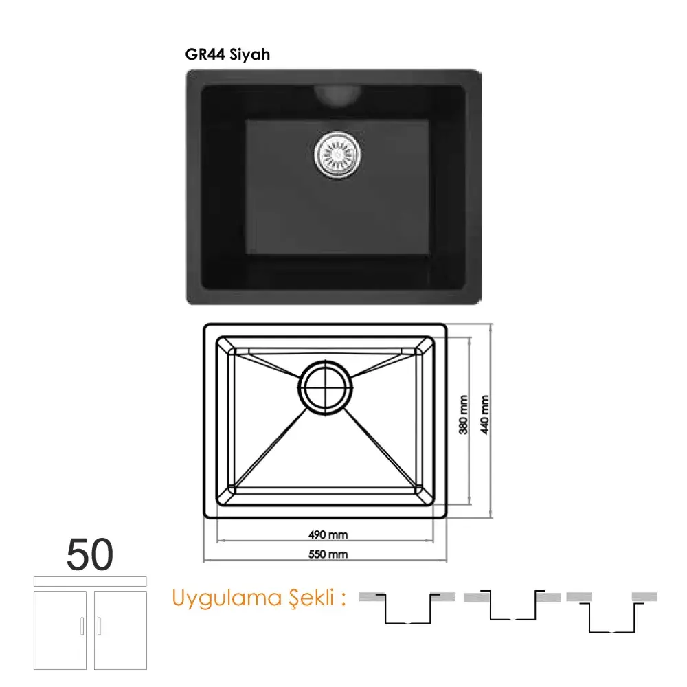 Ürün Adı: Gradde Quartz Tek Göz Granit Eviye 44*44 cm